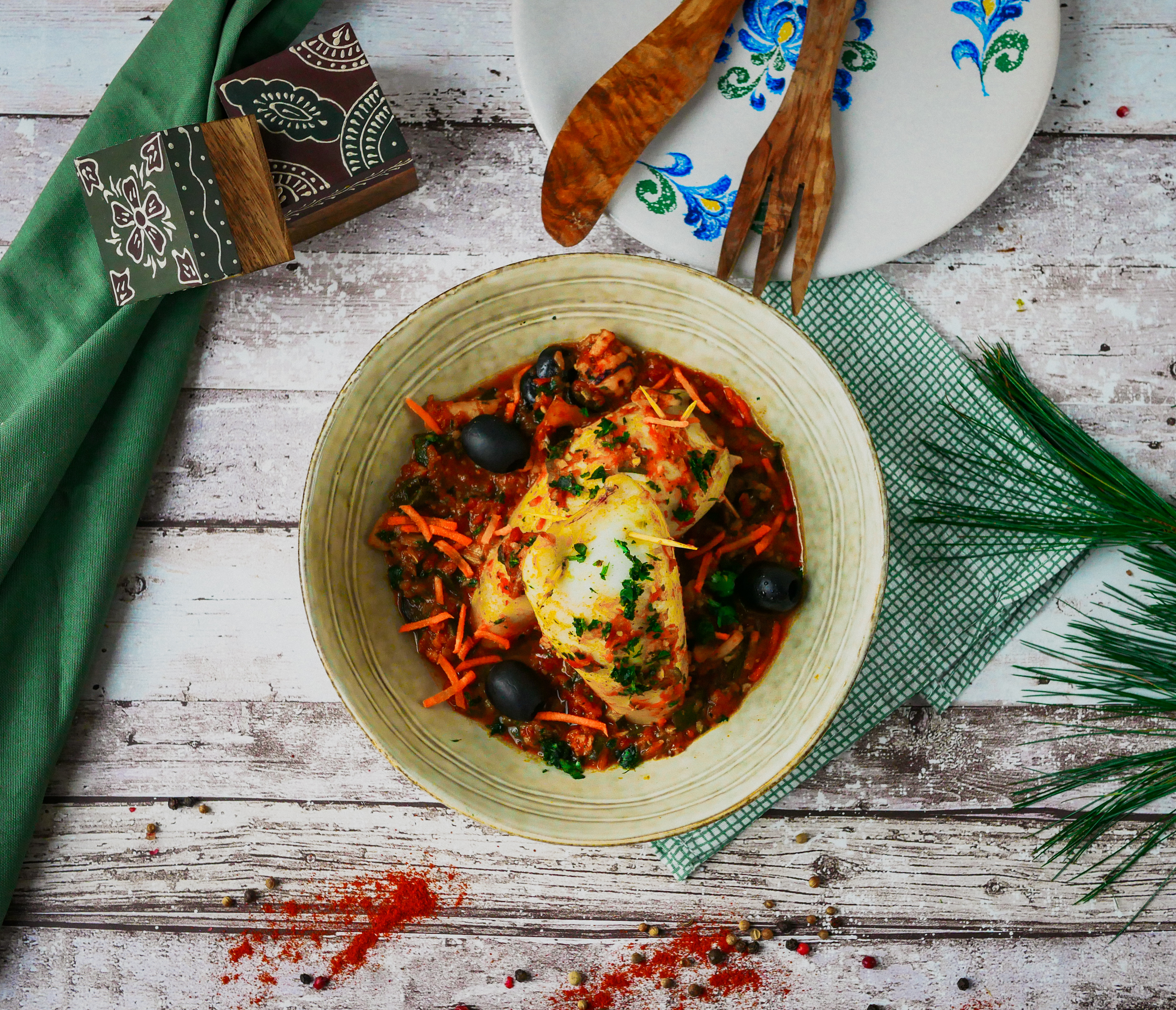 Dans cette recette, j’ai voulu légèrement changer la farce, en m’inspirant d’une recette portugaise. Pour cette farce, j’ai utilisé des légumes et du dos de cabillaud. Le résultat est magnifique.