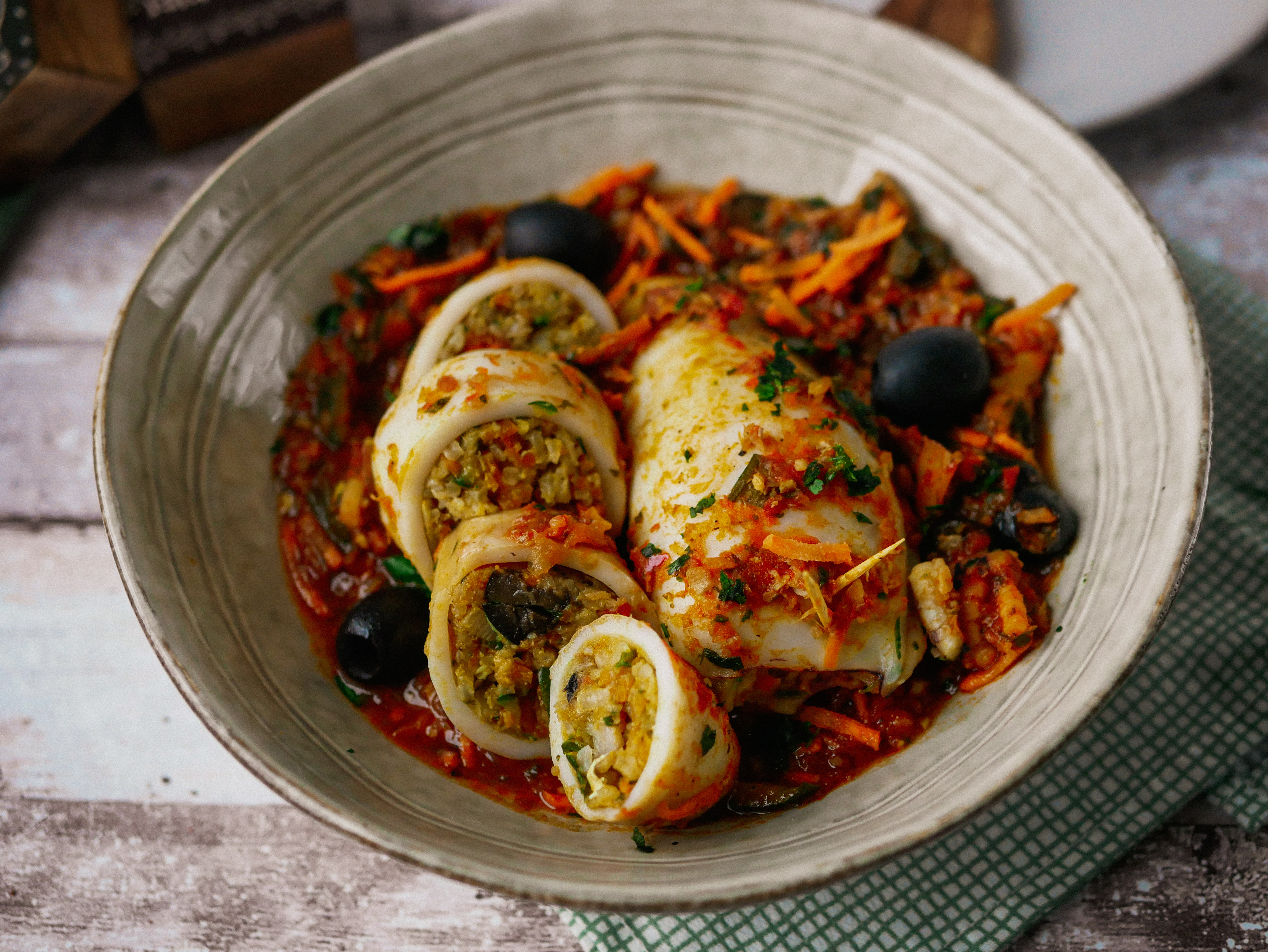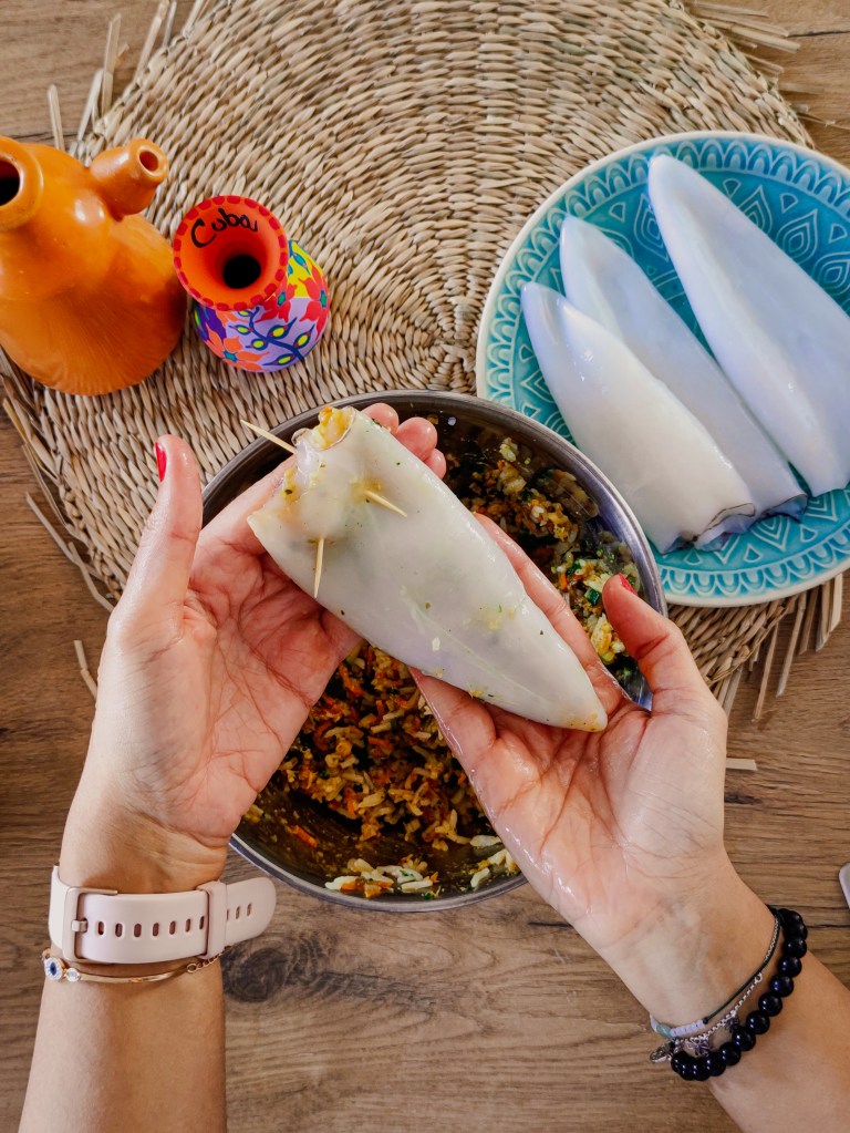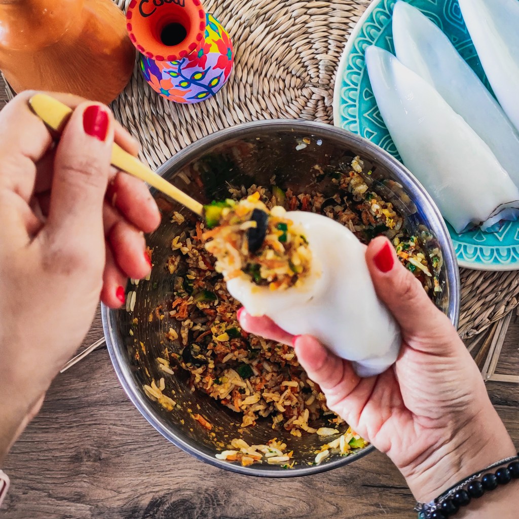 En parlant de culinaire , laissez-moi vous présenter la recette d’aujourd’hui. Le calamar farci est un plat universel qu’on cuisine sous différentes formes. En Tunisie, on fait farcir les calamars avec du persil , du riz ainsi que des épices, puis on les prépare avec du riz Djerbien (riz à base de légumes cuit à la vapeur) ou dans un couscous, un pur délice. D’ailleurs, dites-moi en commentaires, si vous voulez que je poste ces deux recettes.