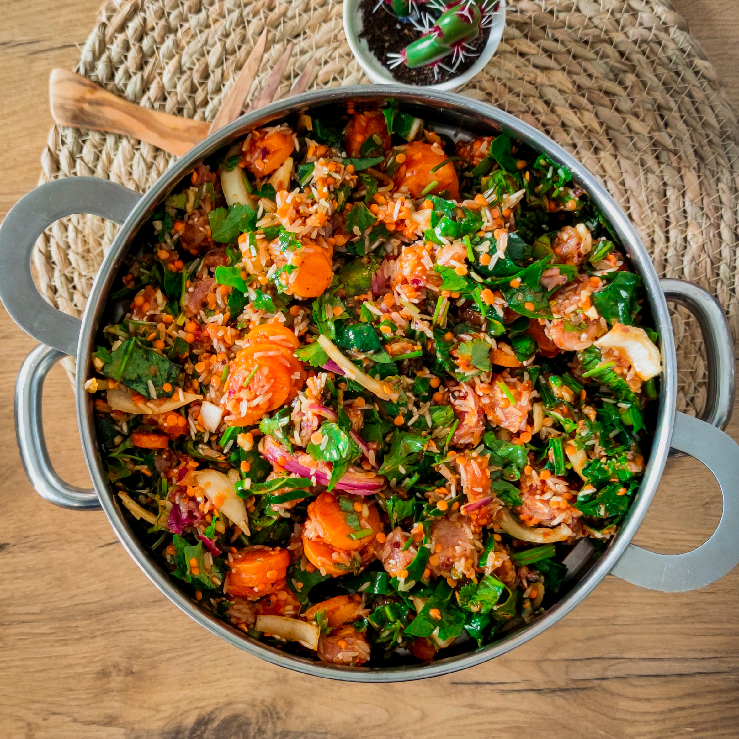 Aujourd’hui, je vous propose un plat que j’adore et qui est typiquement Tunisien: le riz djerbien. C’est un plat complet et équilibré, composé de légumes ( beaucoup de fibres) , de viande (protéines) , de féculents (glucides) et surtout une méthode de cuisson à la vapeur qui est saine.