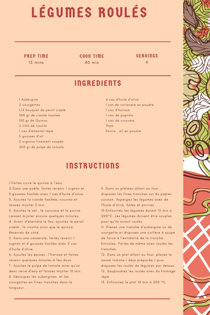Puisque nous avons évoqué la courgette et l’aubergine, je vous ai concocté un plat délicieux à base de ces deux légumes: des roulés de légumes farcis. C’est un plat méditerranéen, riche en saveurs et bon pour la santé, qui va vous faire voyager en plein soleil.